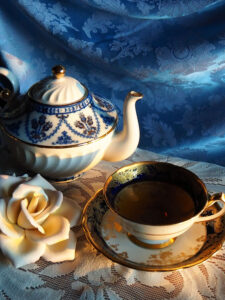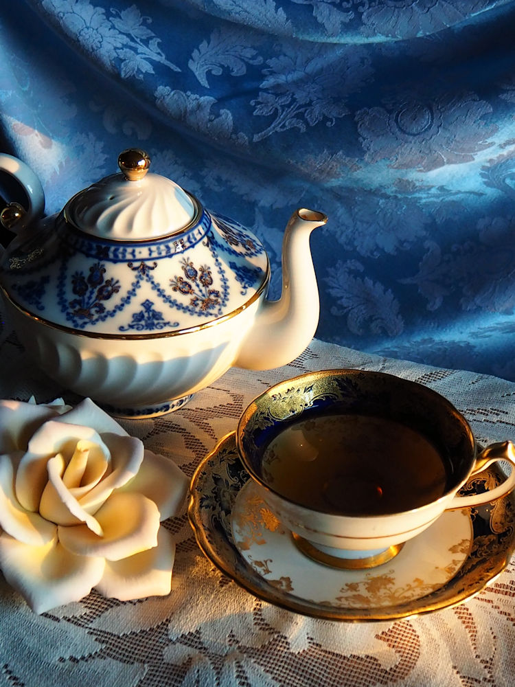 Whenever busyness becomes overwhelming, I take refuge in a cup of tea. Not a fast mug made with a teabag. I make tea in a pot, and pour it into a lovely cup like this month’s winner, the Cobalt Blue with Filigree teacup. Then I sit by a window, look out at the world, and savor my tea slowly.